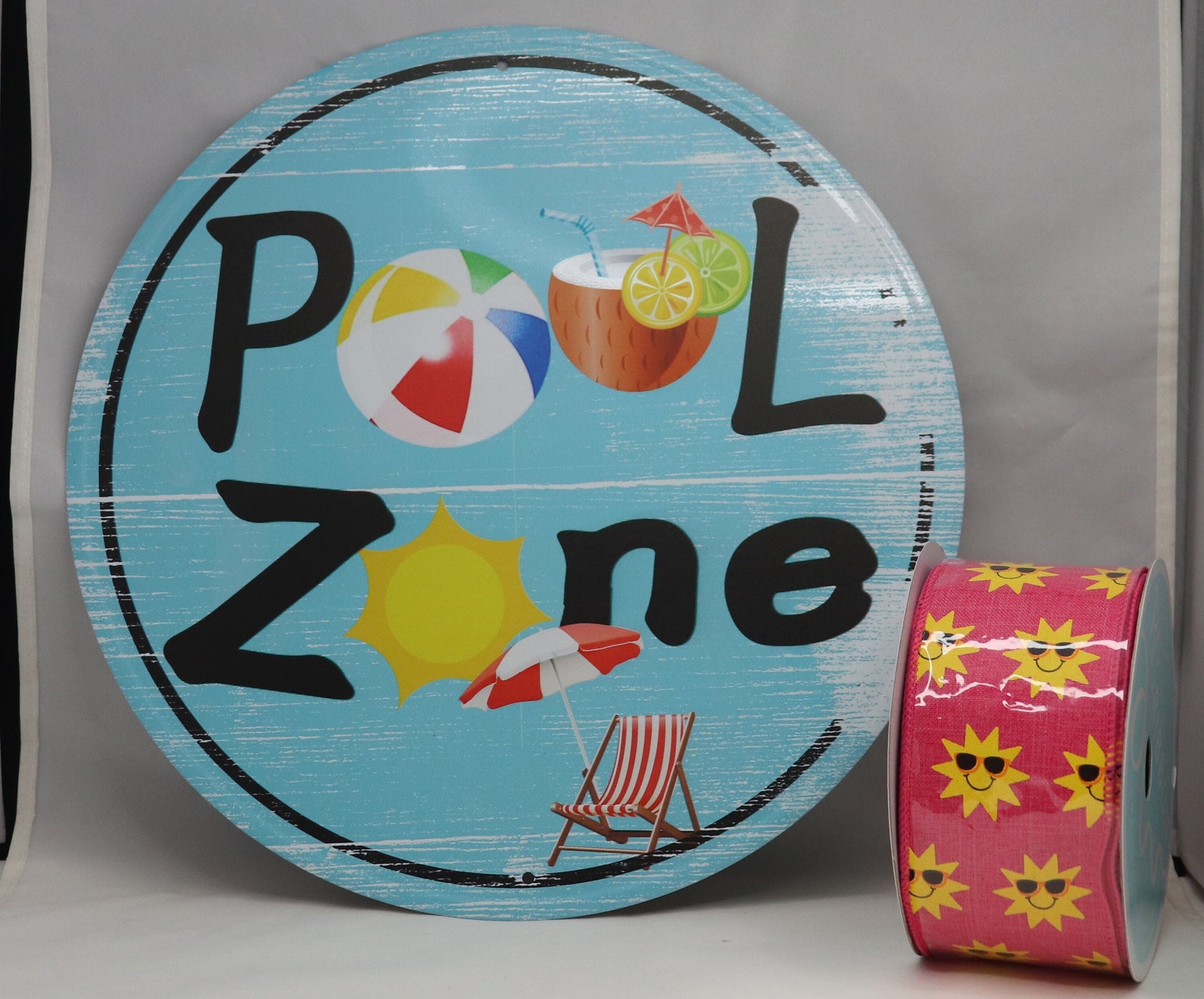 Wreath sign Pool Zone. Comes with 1 roll of sunshine ribbon. Ribbon roll is 10 yards.